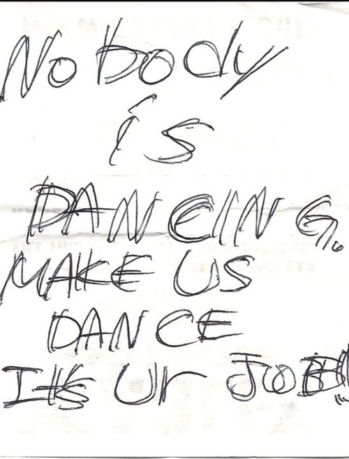 En el articulo hace referencia a una  web que no conocía, NO BREASTS NO REQUESTS en la que básicamente dj’s de todo el mundo cuelgan fotos de avisos, notas o curiosidades  con las que se han topado en sus sesiones.